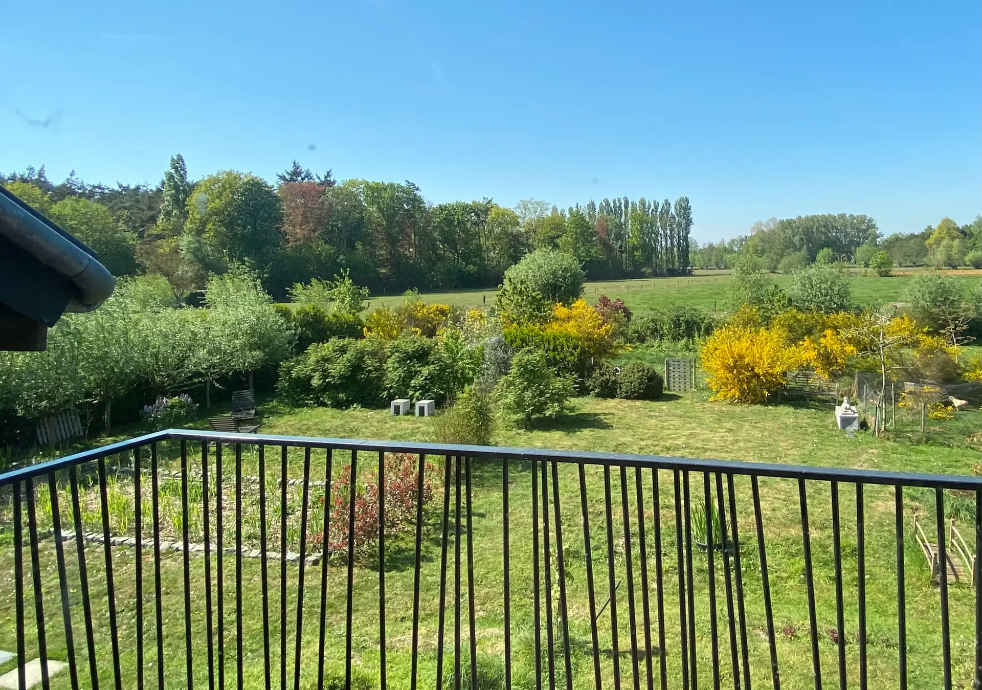 Nestled in the Flemish countryside, the property offers wide open views, a natural swimming pond, and a garden with terraces in both sun and shade.